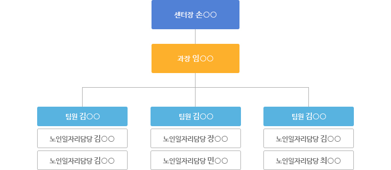 | 팀원 | 김○○ | 055-392-5653 | • 취업 지원(취업알선형:지자체) 전담 • 현장실습 훈련 지원사업(시니어인턴십) 보조 • 통합정보시스템 D/B 운영 및 관리 • 실적 관리 | |